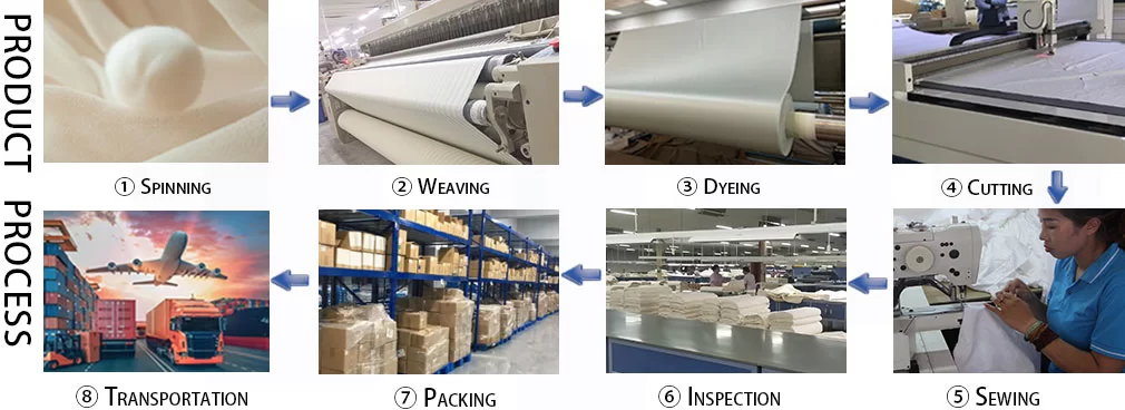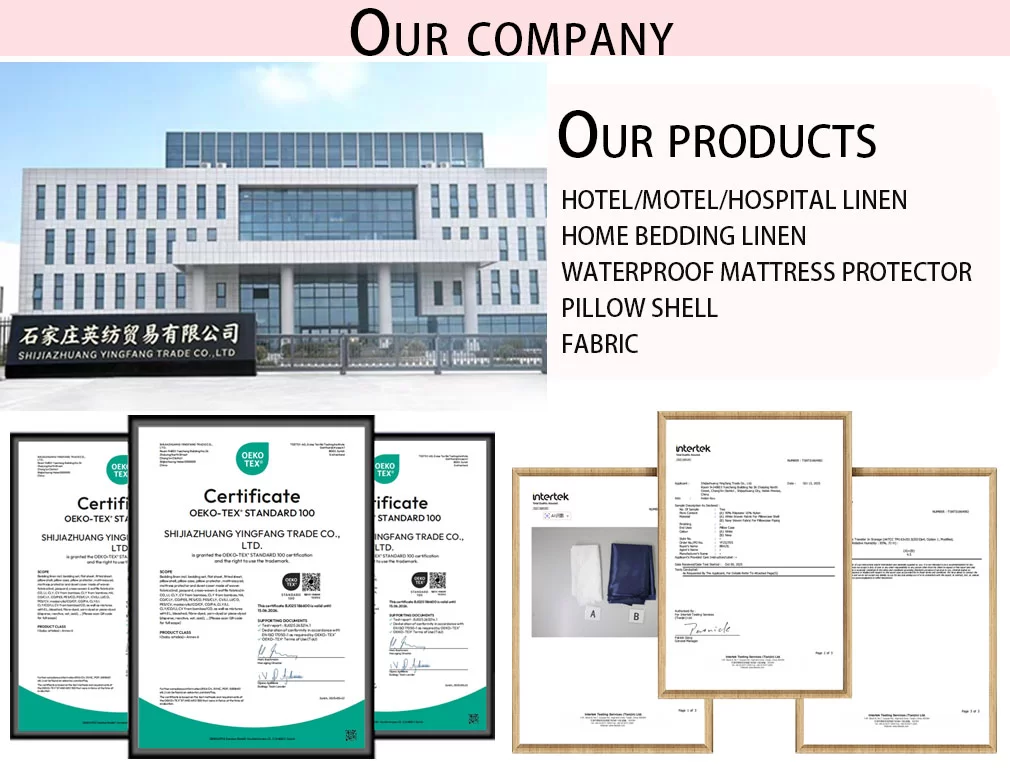 เรา SHIJIAZHUANG YINGFANG TRADE CO.,LTD ผลิตภัณฑ์สิ่งทอที่กว้างขวางประกอบด้วย: ผ้าปูที่นอนสีย้อมสีขาวและภาษีมูลค่าเพิ่มคุณภาพสูง ผ้าปูที่นอนและปลอกหมอน ผ้านวม ผ้าซาตินสีขาวลายและพิมพ์ผ้าห่มผ้านวม ผ้าห่ม หมอน ที่นอนกันน้ำและตัวป้องกันหมอน แผ่นรองที่นอนผ้านวม ท็อปเปอร์ที่นอน ตัวเรือดกันน้ำ enกรณีment ที่นอน เปลือกหมอน ฝาครอบ ผ้ากันเปื้อน อุปกรณ์เสริมและอื่น ๆ ส่วนใหญ่ใช้สำหรับโรงพยาบาล โรงแรม และบ้าน